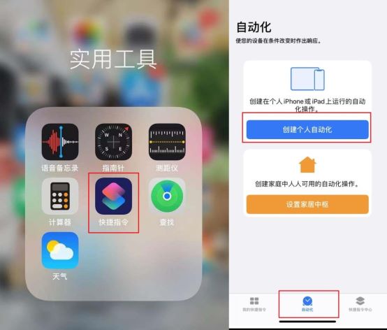 打开快捷指令app,点击自动化,点击创建个人自动化