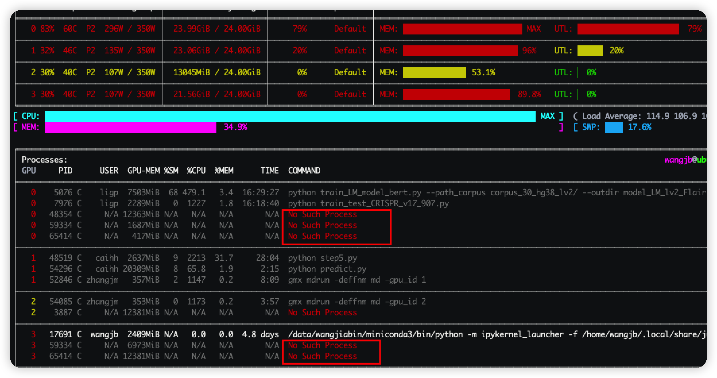 使用GPU进行炼丹的时候,发现了些ghost进程,如图中所示